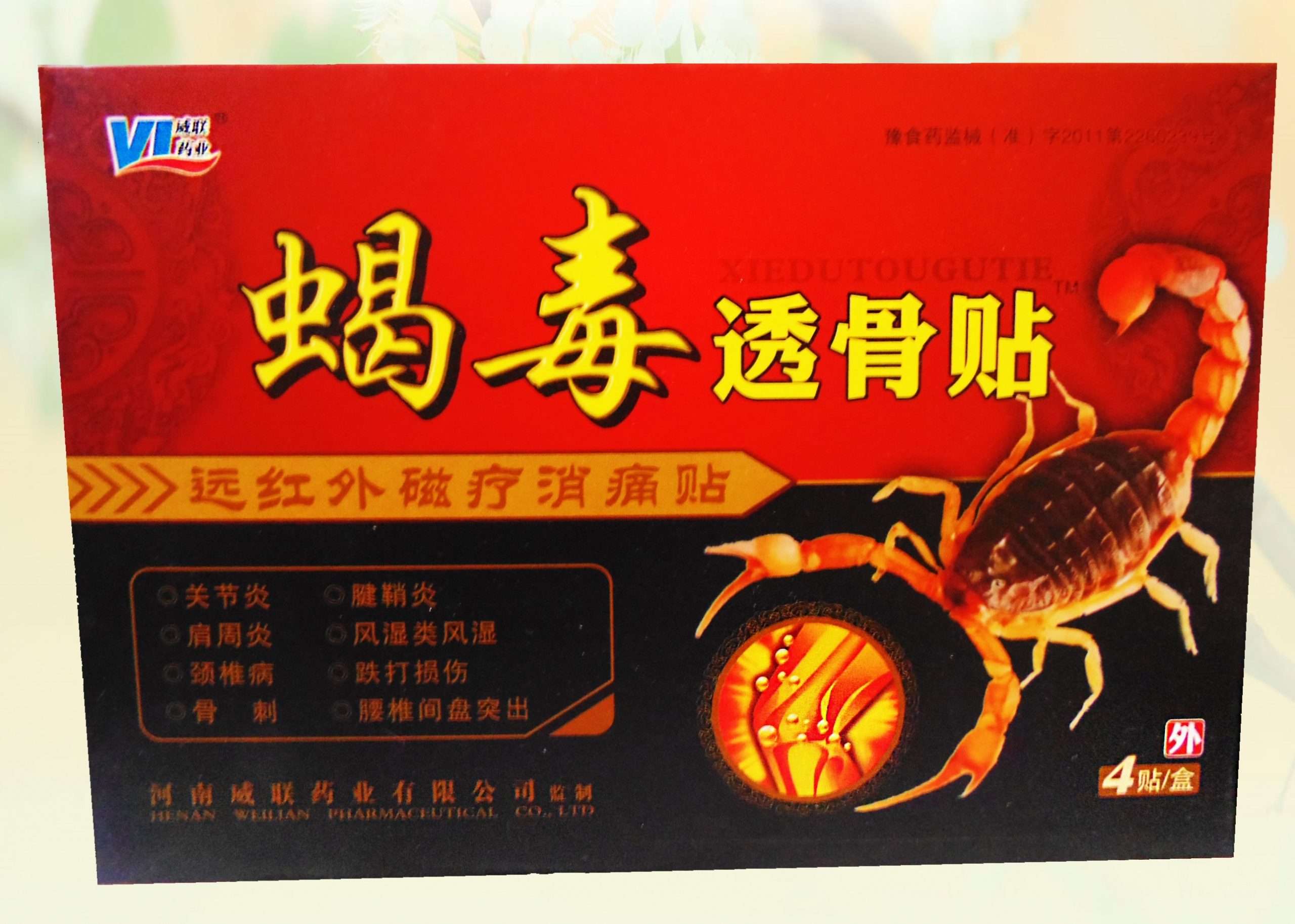 Состав: яд скорпиона, сафлор красильный, давалия (вид папоротника), аконит (корень), каламус драко, a31RTR2PNIE.jpgбосвеллия Картера (смола), мирра, борнейская камфара и т. д. Данная продукция является пластырем нового типа для наружного использования, изготовлена из эффективных элементов вышеизложенного сырья по современной технологии.