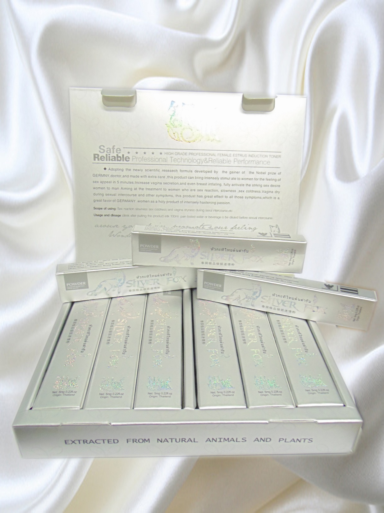 Возбуждающий женский порошок «Серебряная лиса», разработан с использованием широкого спектра целебных растений Таиланда. Препарат обладает быстрым и сильным возбуждающим эффектом для женщин. Женский возбудитель «Серебряная Лиса» не имеет цвета и запаха и полностью растворяется в любом напитке. «Серебряная Лиса» начинает действовать уже через 5 – 10 минут после приёма. Его действие проявляется в усилении влагалищной секреции, чрезвычайном возбуждении и сексуальном влечении женщины к мужчине. Препарат также рекомендуется женщинам, страдающим слабой возбудимостью, отсутствием сексуального желания, сухостью влагалища и другими симптомами нарушения сексуальной функции. При половом акте у женщин происходит усиление выделения влагалищной смазки и сужение мышц влагалища. А также увеличение чувственности и усиление оргазма.