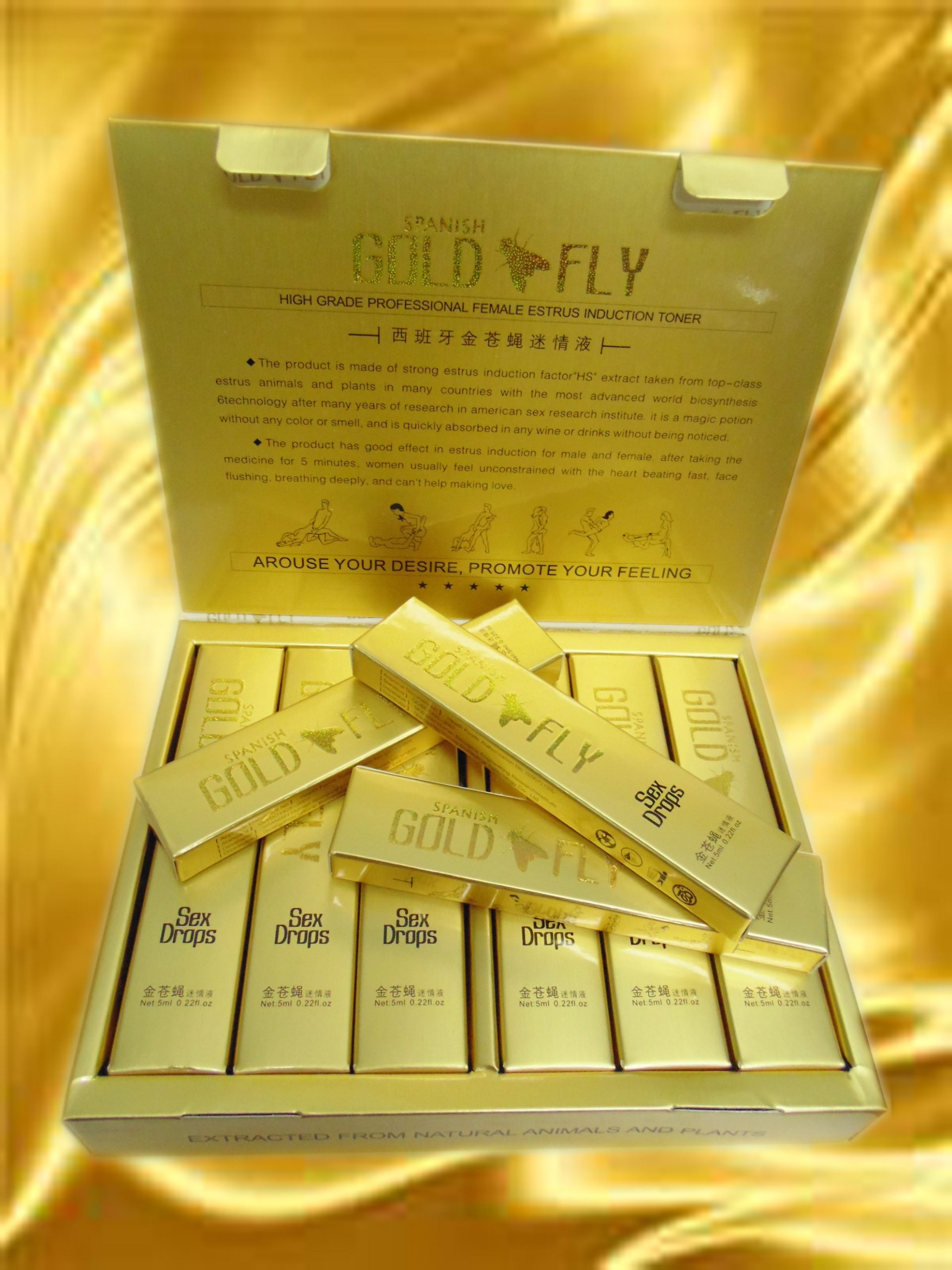Возбуждающая настойка шпанской мушки «GOLD SPANISH FLY». Чудодейственная сила этого продукта, созданного с использованием сильнодействующего возбуждающего экстракта «HS», добытого из шпанской мушки (Spanish Fly), поможет Вам создать незабываемую ночь для Вас и Вашего партнера. Возбуждение будет очень сильным. Всего через 15 минут после приема, женщина чувствует себя расслабленной и возбужденной, ее сердцебиение и дыхание учащаются, на лице появляется румянец — и она уже готова сгорать от страстной любви.